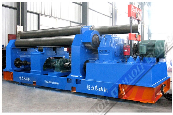 本機結構型式為三輥對稱(chēng)式,上輥在兩下輥中央對稱(chēng)位置作垂直升降運動(dòng),通過(guò)絲桿絲母蝸桿傳動(dòng)而獲得,兩下輥作旋轉運動(dòng),通過(guò) 減速機的輸出齒輪與下輥齒嚙合,為卷制板材提供扭矩。本機床的缺陷是需借助其它設備實(shí)現預彎。本設備可卷板厚1mm-40mm,板寬8000mm的板料。